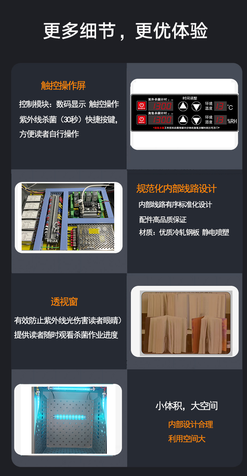 (1)殺菌消毒方式:具有單選紫外線殺菌、也可以單選臭氧殺菌模式,也可以紫外線+臭氧同時殺菌消毒模式;兩種殺菌時間都可單獨通過控制按鍵設置。